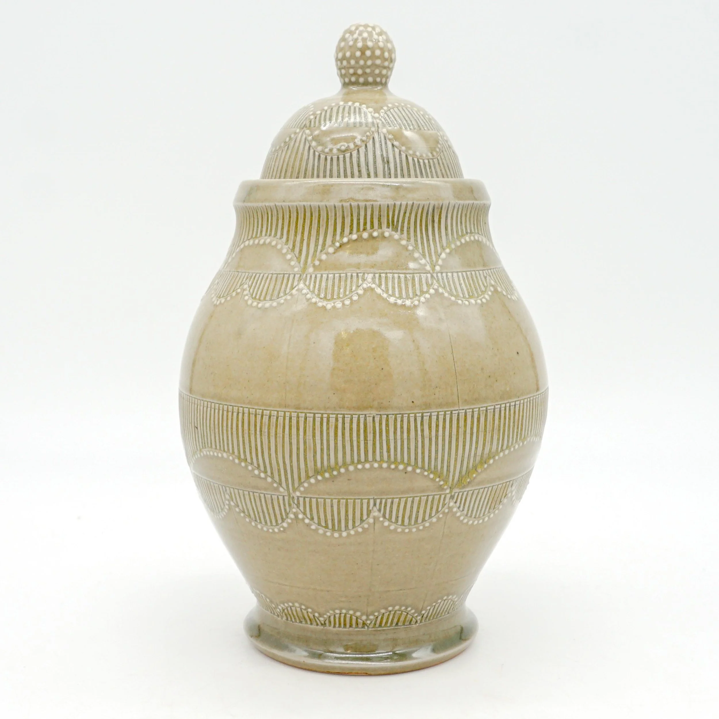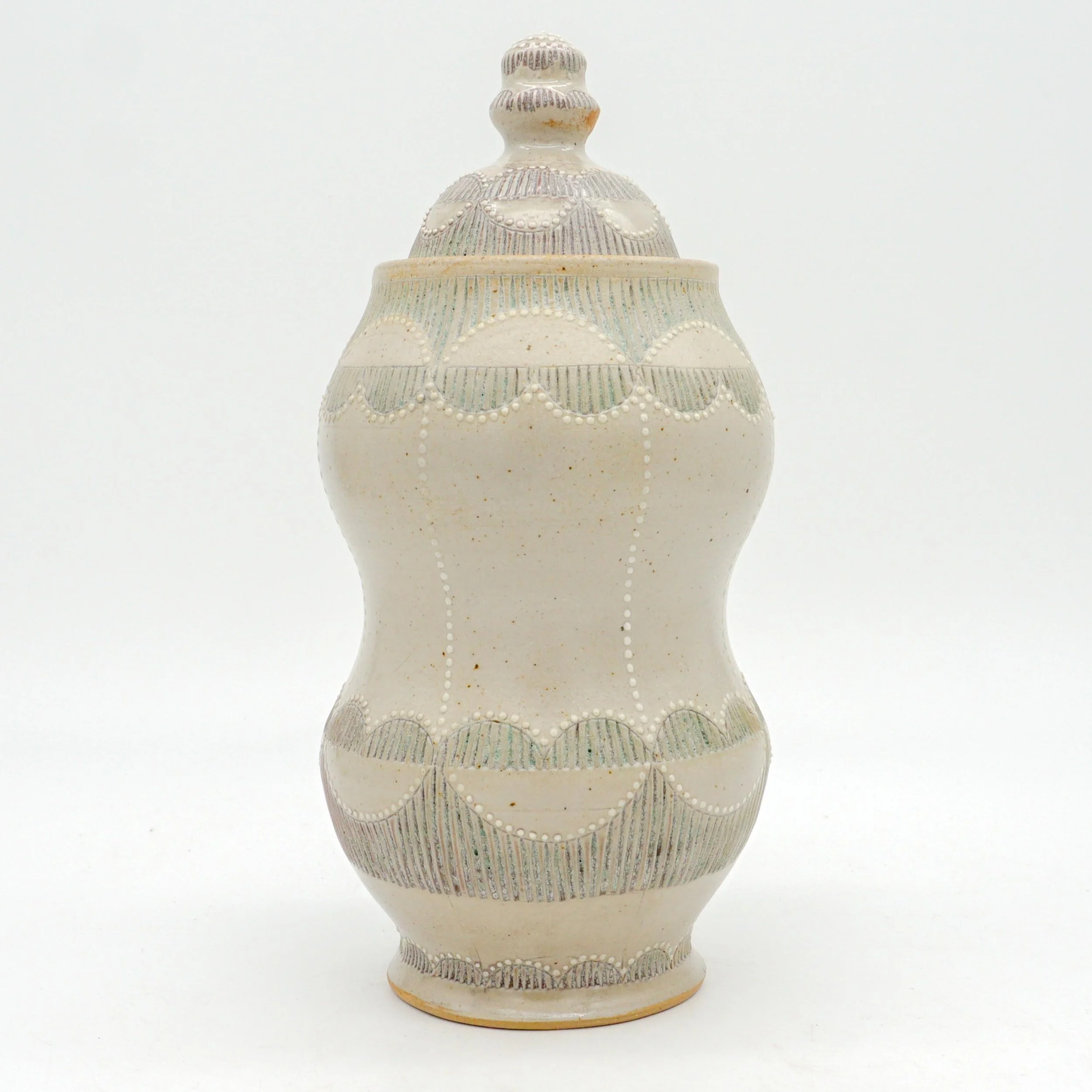 As a potter, I live for drama. A strong theme throughout my work since the beginning of my practice is a propensity for flair. Undulating silhouettes, matching fluttery lips and feet, carefully carved lines, tediously slip-trailed dots, and the occasional belts of human teeth are all recurring themes in my vessels. I am especially attracted to high contrast forms and concentrated detail that invites the viewer to inspect my pieces. Lidded vessels have become a favorite of mine to make for the opportunity to carry the visual elements on the body of the piece over onto the lid. Creating a satisfying close to the form, the lid is a second opportunity to ensure that surface alterations of the body are woven throughout the form.