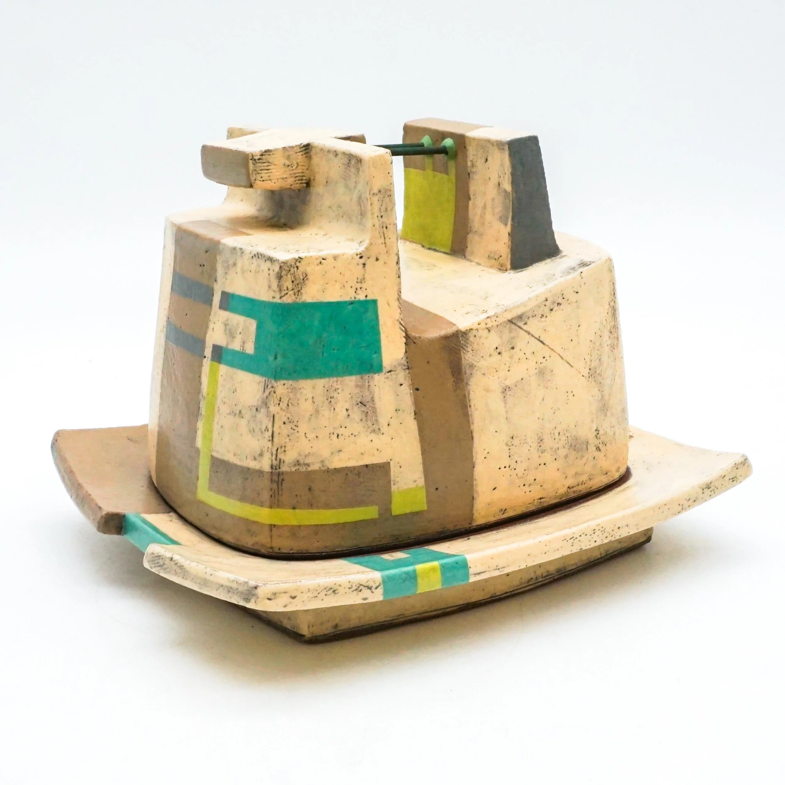 I have discovered that there are physical processes, which make me feel personally connected to my work, challenge my skills and propel ideas. These processes have been mainly throwing on the wheel and then altering the forms with the addition of hand-built elements. This process sets up a marriage of the organic and geometric that is critical for me. I want the eye to move around and in and out of forms, which is done through the arrangement of planes and edges. These arrangements of form, color, shape, line and texture are evidence of a combination of absorbed visual life experiences. I see a combination of city influences from my upbringing in an urban environment paired with rural landscape components that surround me now daily. These influences appear as abstract universal symbolism, having plural meanings that relate to landscape and architecture. My formal approach seems to be a cyclical examination in the power of juxtapositions. Experimentation and improvisation continue to be important to me as I am repeatedly asking myself “What if?” working through each form. I sense a balance between the rational and spontaneous during the making process.
